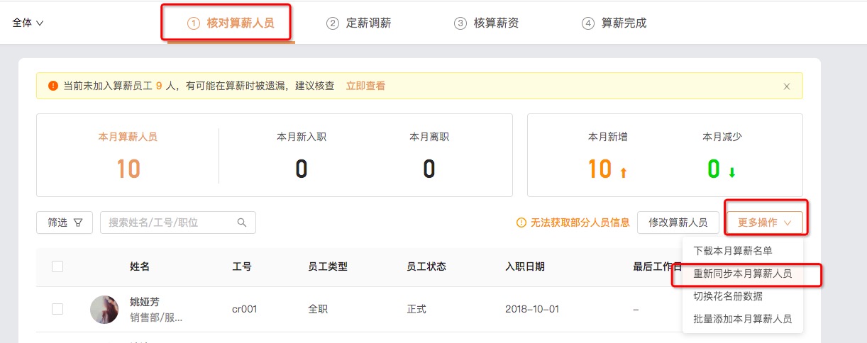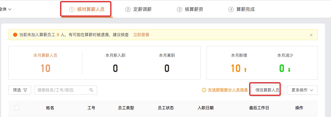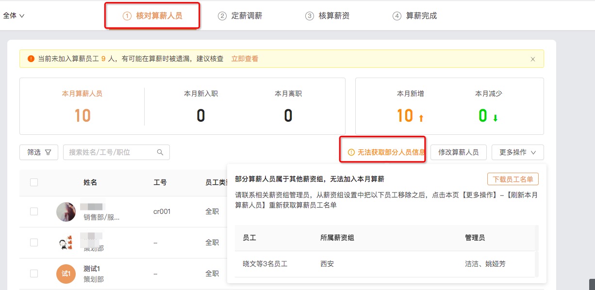第一种情况:我们需要看下在调整旁边是否有黄色字体提示-无法获取部分人员信息。