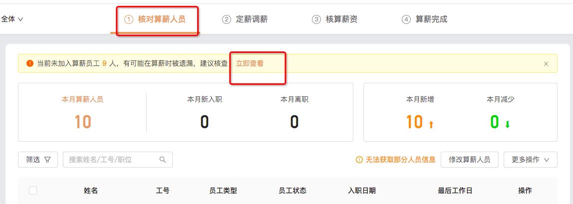 第二种情况:点击立即查看,看下员工是否没有加入薪资组,原因是员工在智能人事中入职日期/离职日期/部门等相关人事信息没有维护。